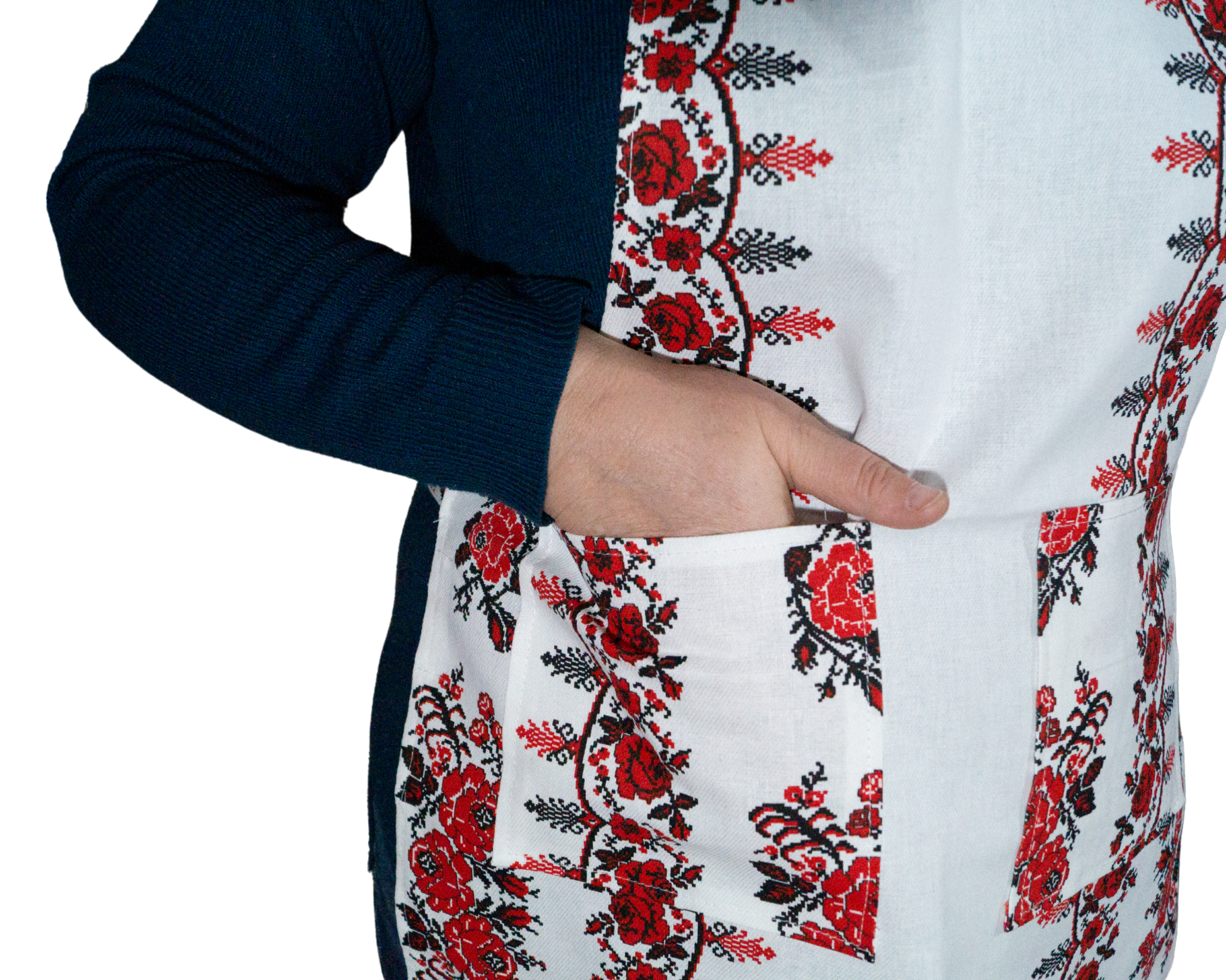 This traditional cotton apron combines utility with beauty, being decorated with an authentic floral pattern in vibrant shades of red and white. Equipped with practical pockets and made from natural material, it is ideal for cooking, serving, or simply adding a touch of tradition to your daily routine. Comfortable, practical, and with a design that evokes the elegance of Romanian folk attire.